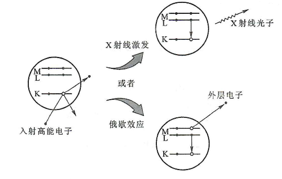 在外界作用下,如一个能量足够高的入射电子碰撞原子,使原子的内壳层电子电离,在内壳层产生了一个空位,外壳层电子将跃迁至这个空位,并发射一个光子,由于内壳层电子的束缚能比外壳层电子大得多,发射的光子频率一般落在X 射线波段,这样形成了X 射线的特征发射谱. 内壳层电子也可以吸收外来的X 射线光子而被电离,这就形成了X 射线的特征吸收谱.