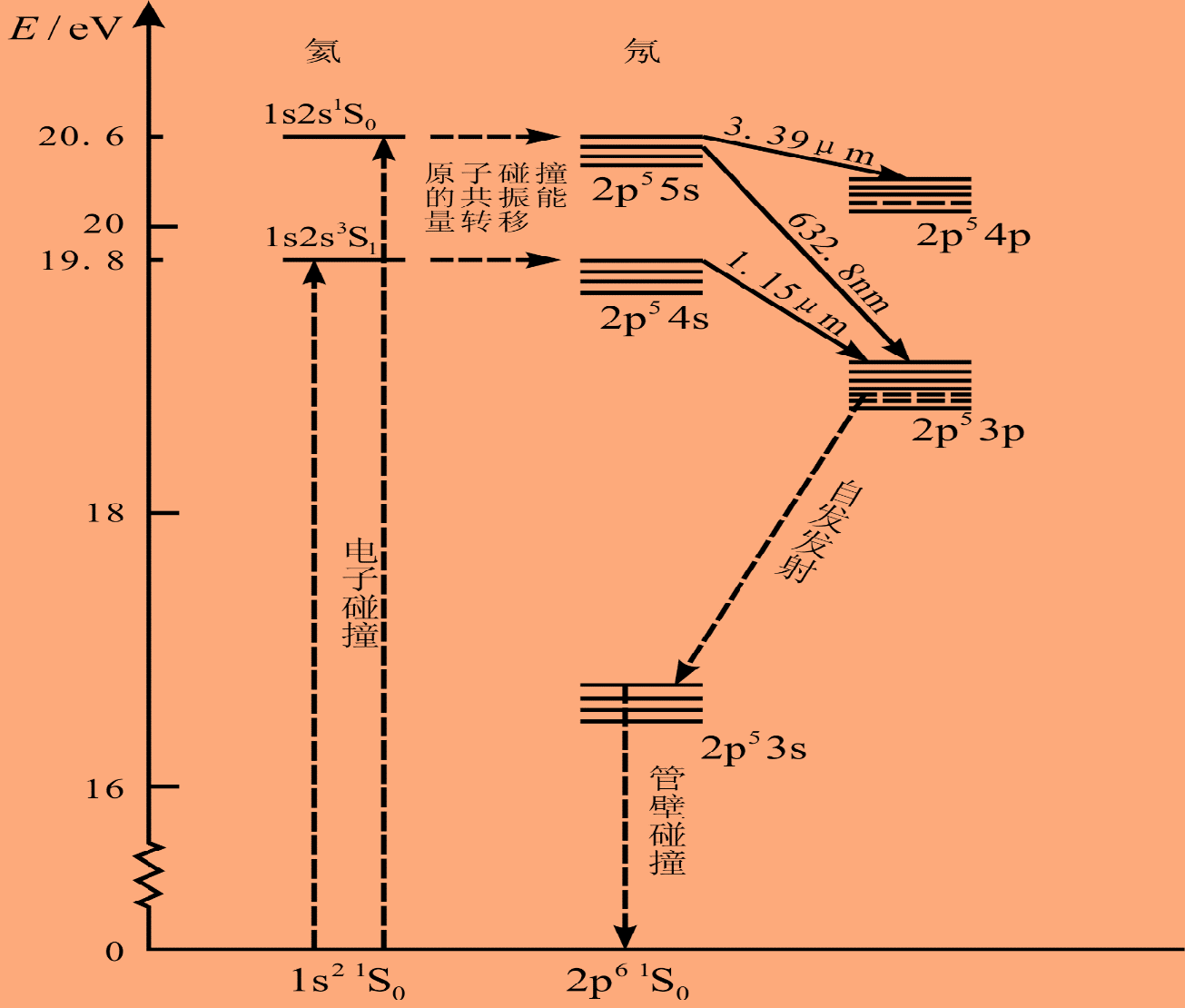 电子经电场加速后,与He碰撞。处于激发态的He与Ne碰撞,把能量传递给Ne,使它在亚稳态(2p55s、2p54s )和激发态(2p54p、2p53p )之间形成反转分布。